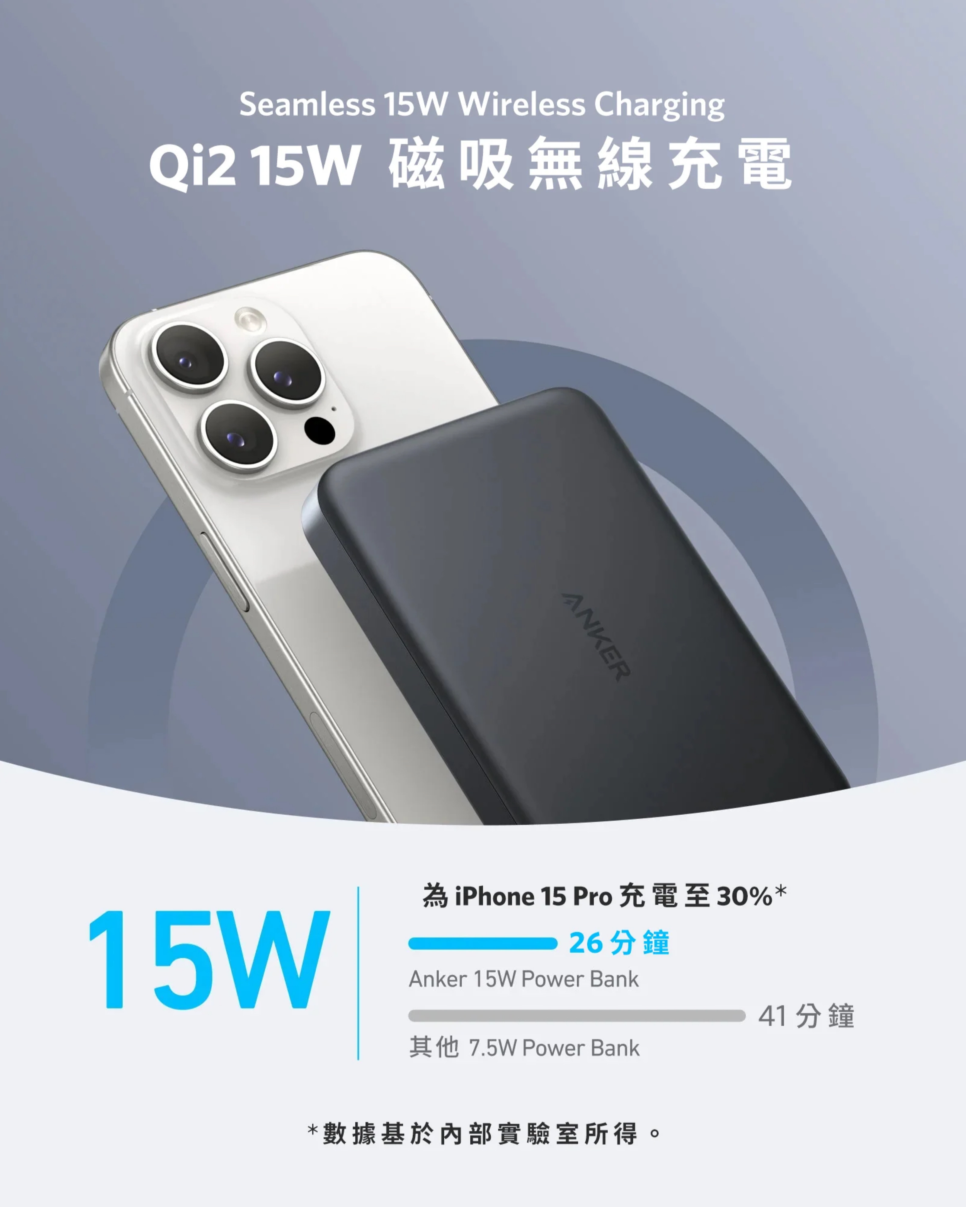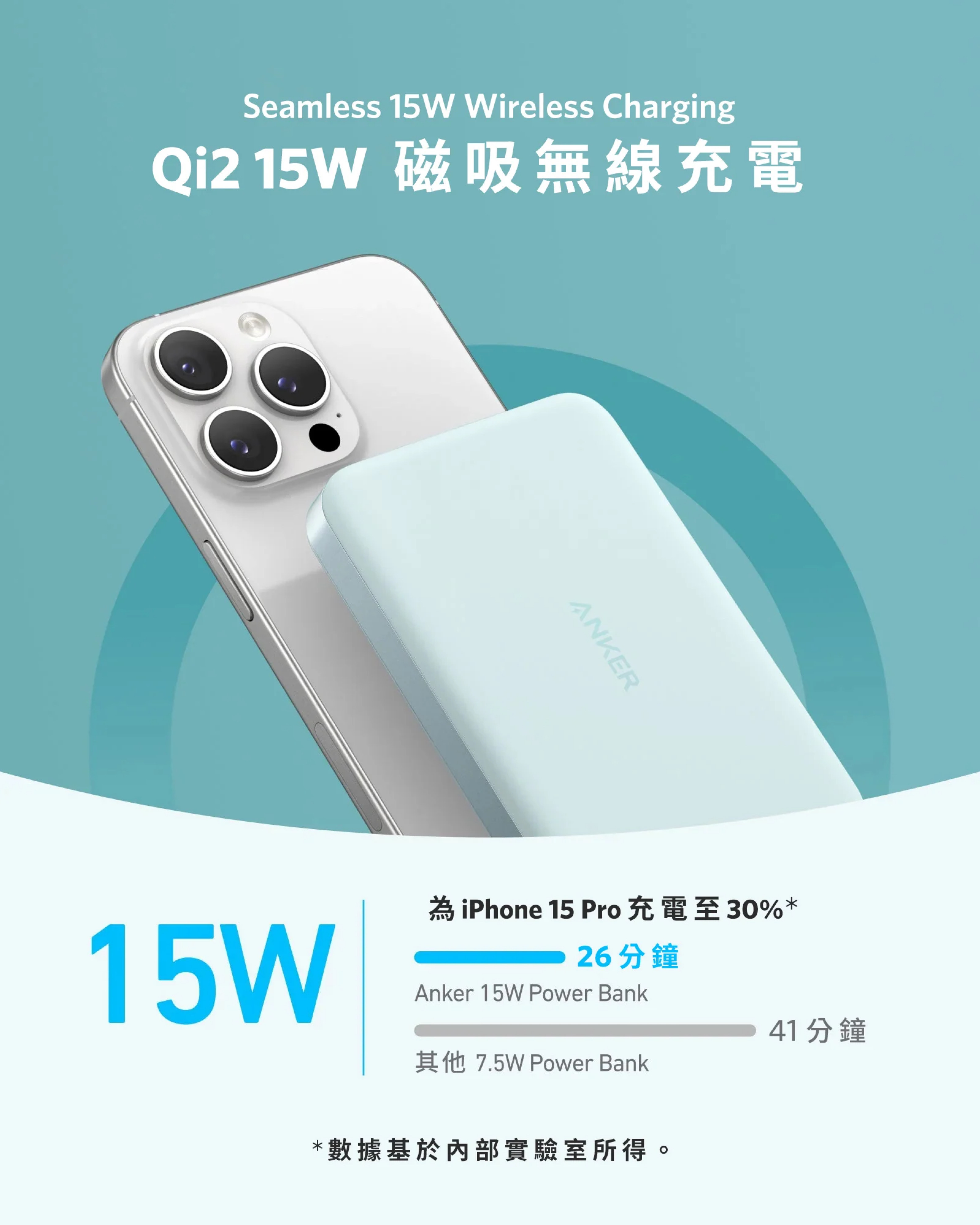 相比起7.5W無線輸出,使用最大15W的無線快充技術,提供兩倍的充電速度。15W的無線快充可為iPhone 15 Pro 由 0% 充電至 50% 只需 51 分鐘。
