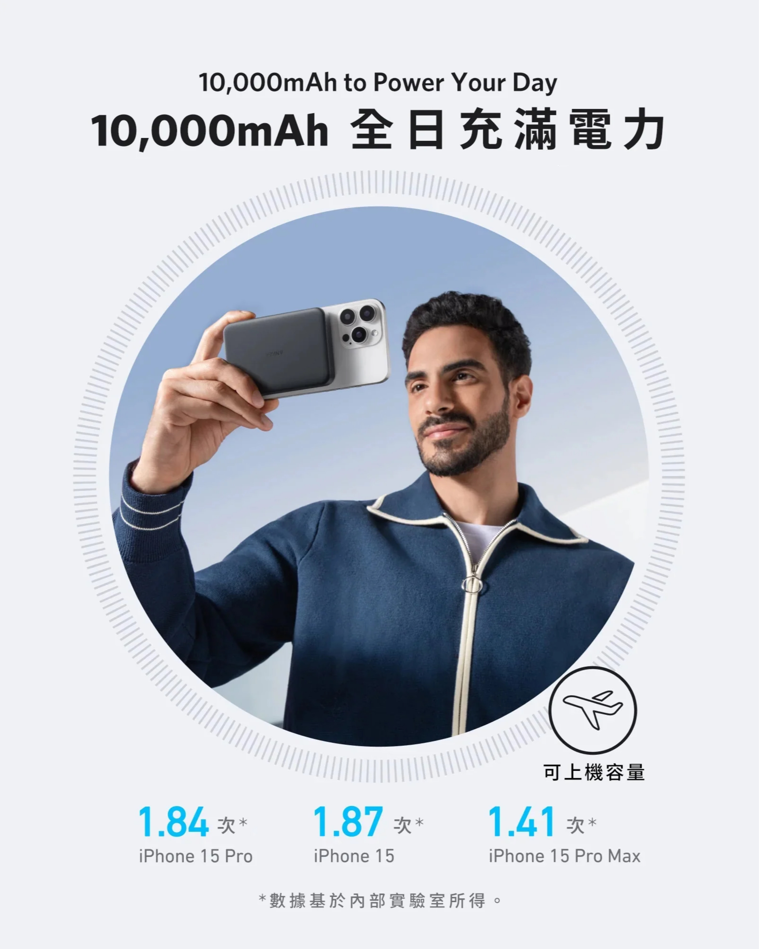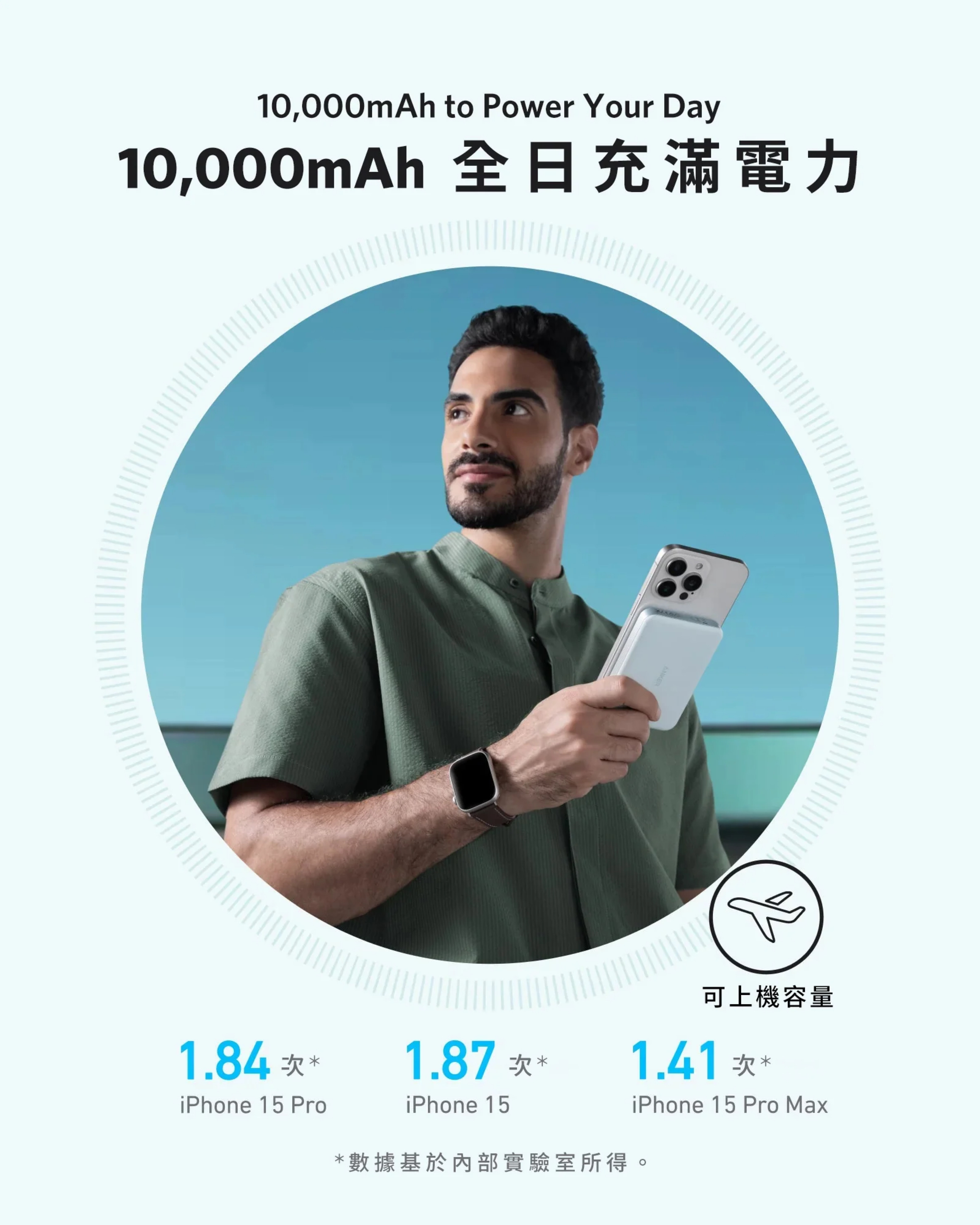 僅約 15mm,尺寸細小,方便攜帶,輕鬆放入褲袋及小手袋;具 10,000mAh 電量,可為你的iPhone 15 Pro 充電約1.8次。