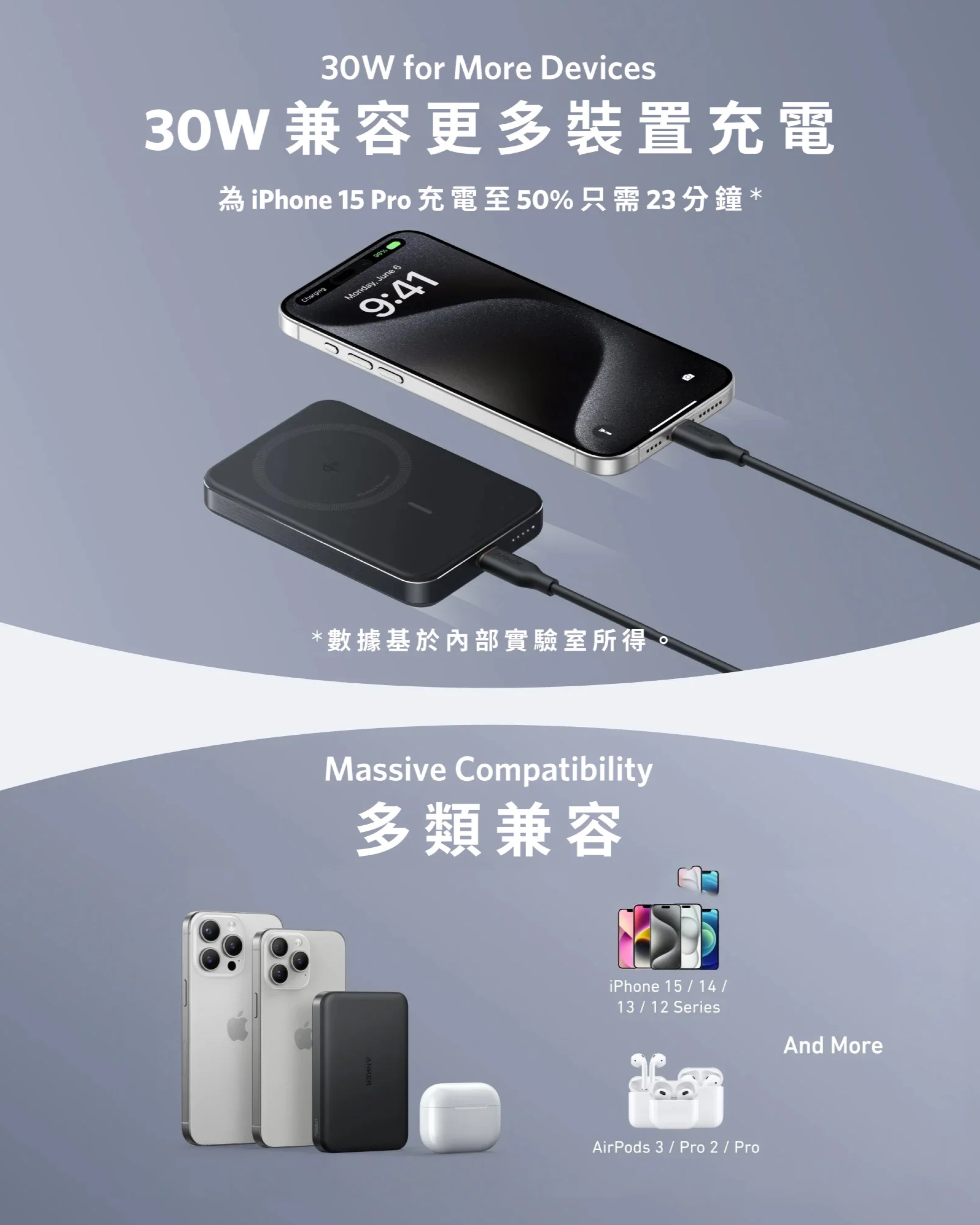 支援最大30W USB-C PD 快速充電,為你的iPhone全速充電;使用30W輸出充電器,即可在2.5小時為行動電源充飽電